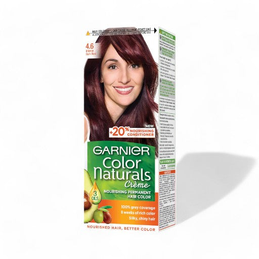 GARNIER Color Naturals No. 4.6 (Intense Dark Red)Enriched with 3 essential oils, olive, almond and avocado, Garnier Color Naturals leaves your hair looking shiny, silky and nourished. The no ammonia creame formula comes with a superior color lock technology that gives you rich color that lasts up to 8 weeks. Check...