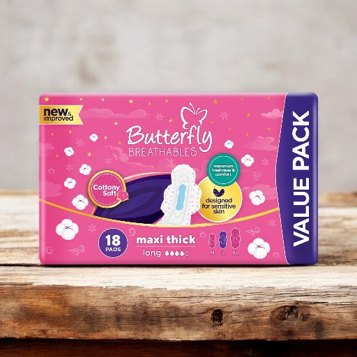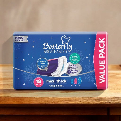 Butterfly Breathable Fabric Soft Top Sheet Maxi Thick Long 18 PadsButterfly Breathables Maxi Thick with Fabric soft top sheet is designed to give you maximum absorbency along with rash-free comfort with cottony wings. Unique fabric soft top sheet Breathable Back sheet fast absorption of the liquid Leak guards Long size 18 pieces