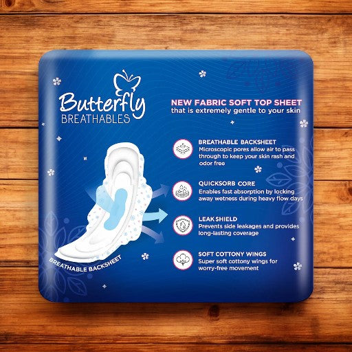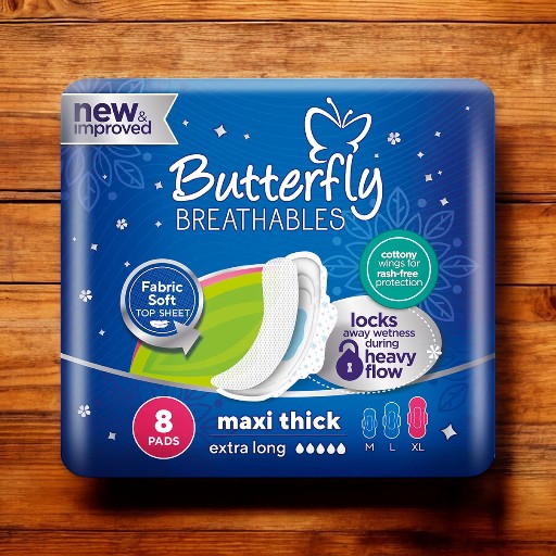 Butterfly Breathable Fabric Soft Top Sheet Maxi Thick Long 8 PadsButterfly Breathables Maxi Thick with Fabric soft top sheet is designed to give you maximum absorbency along with rash-free comfort with cottony wings. Unique fabric soft top sheet Breathable Back sheet fast absorption of the liquid Leak guards Extra Long size 8 pieces