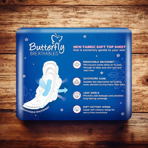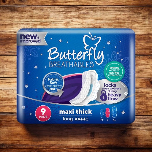 Butterfly Breathable Fabric Soft Top Sheet Maxi Thick Long 9 PadsButterfly Breathables Maxi Thick with Fabric soft top sheet is designed to give you maximum absorbency along with rash-free comfort with cottony wings. Unique fabric soft top sheet Breathable Back sheet fast absorption of the liquid Leak guards Long size 9 pieces
