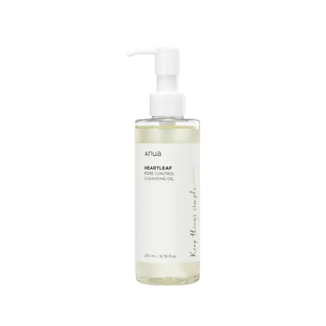 Anua Heartleaf Pore Control Cleansing Oil (200ml) – a gentle oil cleanser that removes makeup, oil, and dirt from your skin. It helps clean pores deeply and keeps your skin soft, fresh, and clear. Perfect for double cleansing.